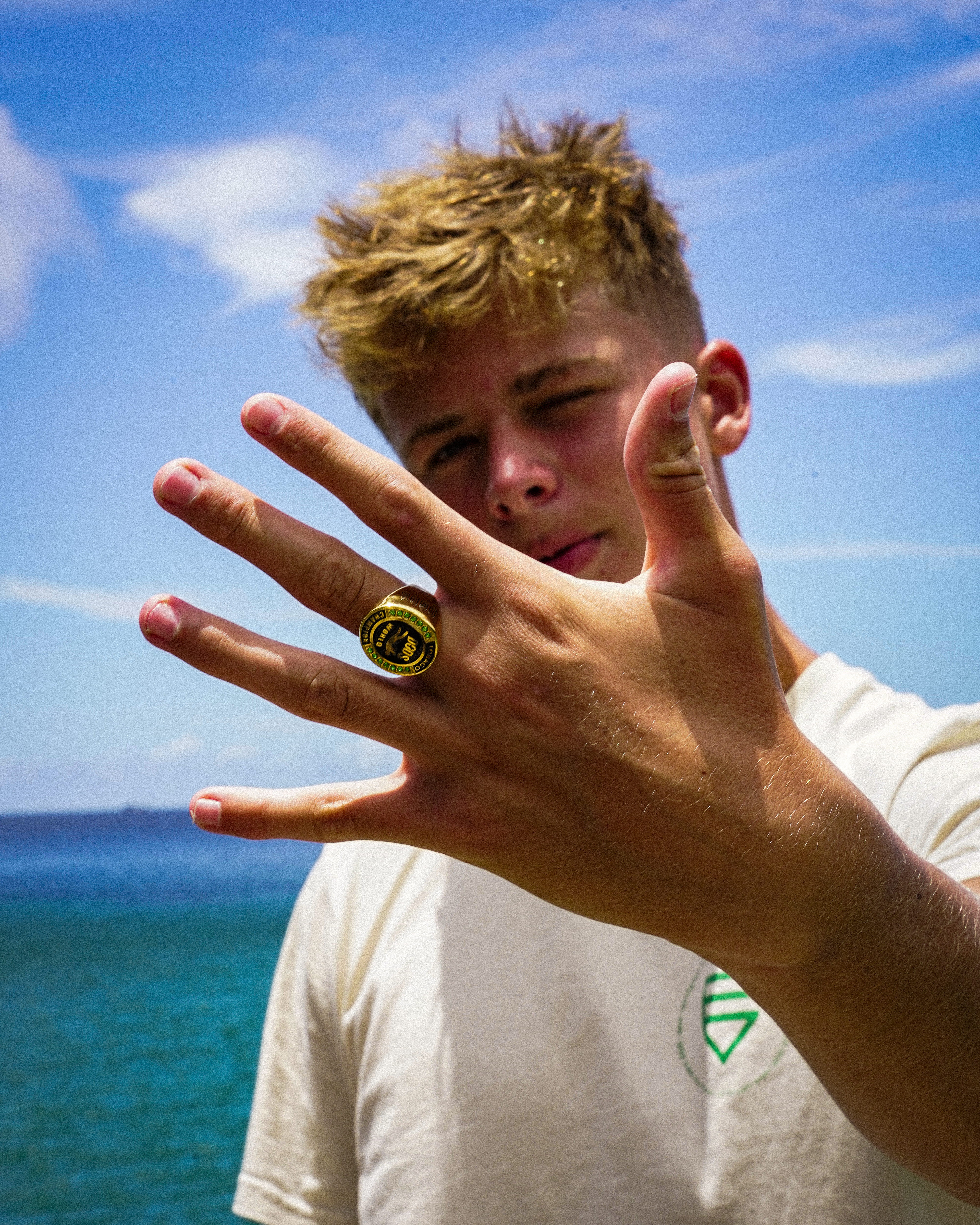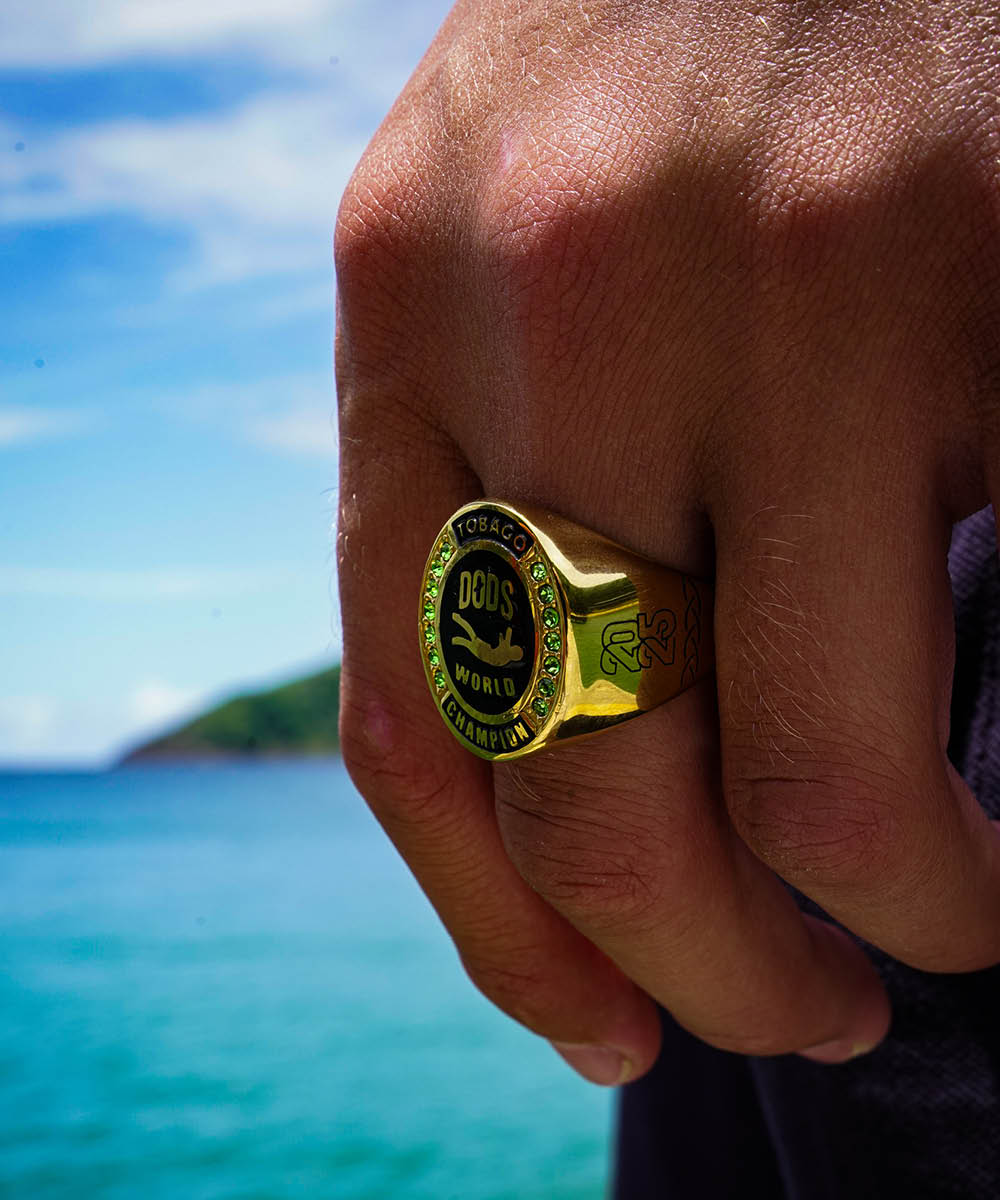 The ring is surrounded by green gemstones, inspired by the tropical surroundings of Tobago – the island's lush nature, the cliffs, and the clear water where the world championship was held.